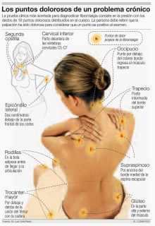 La fibromialgia es una enfermedad crónica que se caracteriza por fatiga (cansancio) y dolor musculo-esquelético generalizado, con una exagerada hipersensibilidad en múltiples puntos predefinidos en el cuerpo (cuello, hombros, espalda, caderas, brazos y piernas) que duelen al ser presionados.